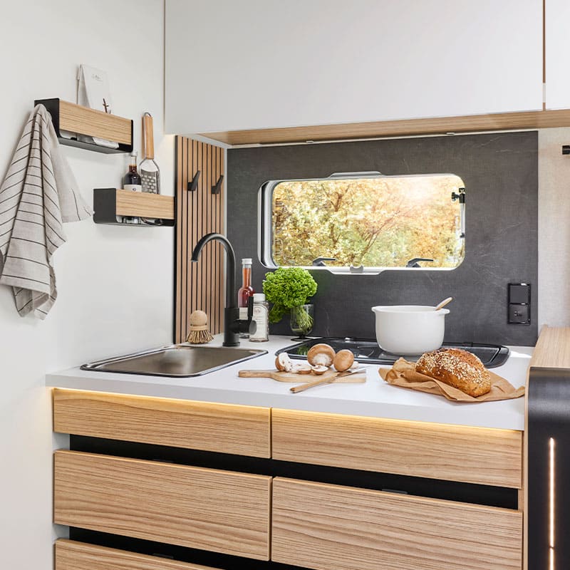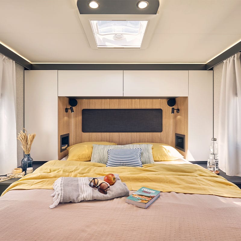 La cellule de nos camping-cars intégraux a été pensée pour faciliter la circulation : vaste salon, espaces jour sans marche, salle de bains spacieuses et chambres confortables.