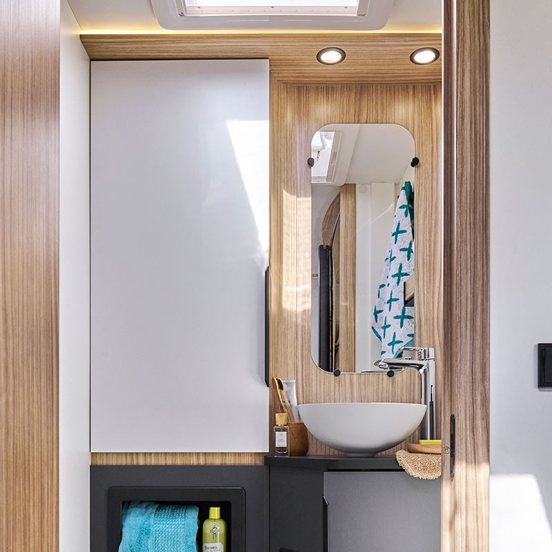 - Un chauffage hybride Combi D6 E TRUMA® 6 000 W fonctionnant au diesel et à l’électricité (230 V), pour une montée en température plus rapide et une plus grande autonomie que le gaz.